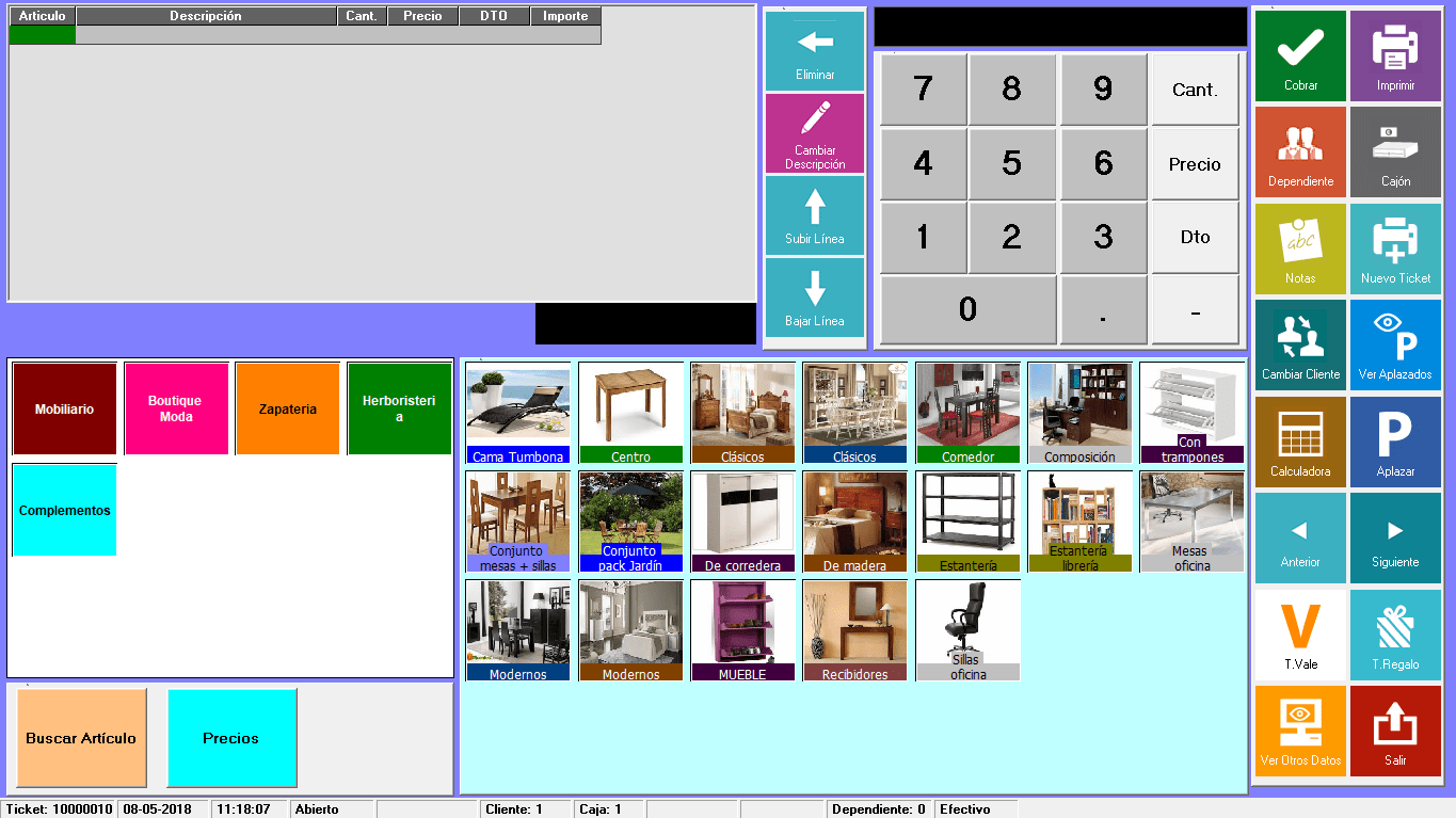 Doscar TPV Comercio programa fácil y sencillo para la gestion completa de comercios. Creación y modificación de artículos por referencias, control de stock de forma fácil e intuitiva, también genera etiquetas para la impresión de código de barras. Control de tallas y colores o por número de serie.Generación de presupuestos, proforma, albaranes, y factura de ventas y compra. Exportación de listados e informes a excel, pdf y word.
